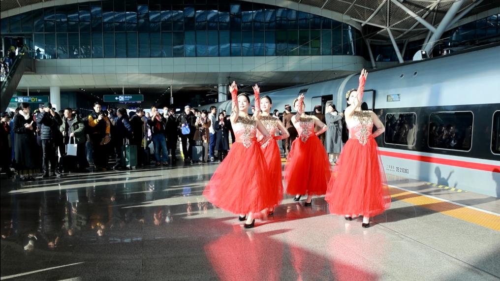 1月5日,工作人员在武汉站站台上表演节目,庆祝武汉始发至香港高铁列车开通。汪高 摄