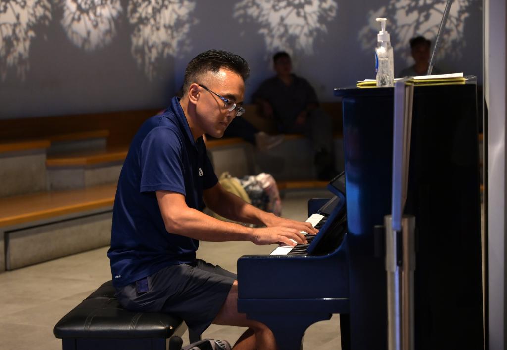来自日本的道畑俊宏在中环中心“H6 CONET”弹奏共享钢琴(2024年9月5日摄)。新华社发(谭佳铭 摄)