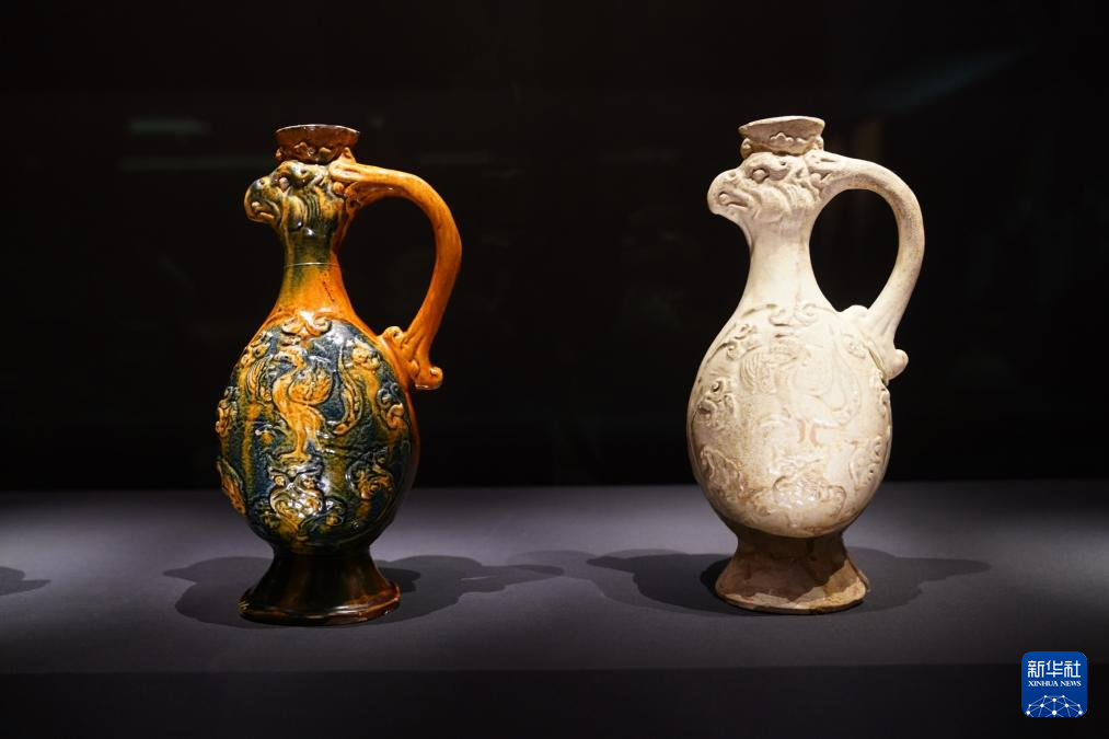 继续前行,便来到“跨越文化——胡食风尚”单元。故宫博物院藏唐代凤首壶与旧金山亚洲艺术博物馆藏凤首壶“并肩而立”,它们独特的把手与流口设计,仿佛诉说着胡人倾注式倒酒习俗对中原的影响。