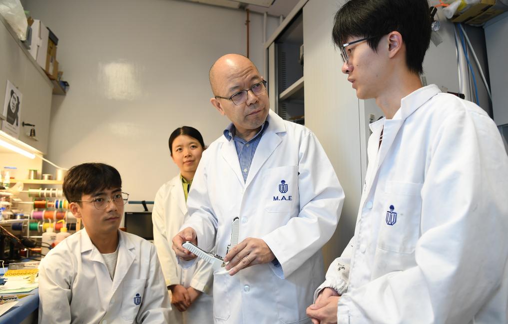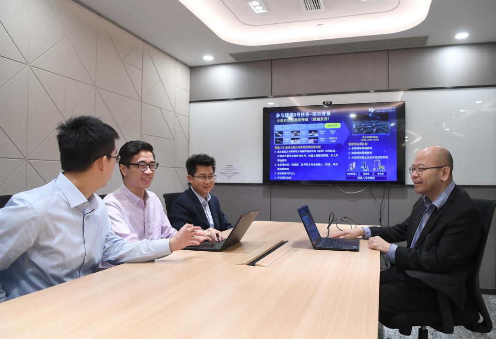 6月19日,香港太空机械人与能源中心联合主任于宏宇教授(右二)在实验室与团队成员交流。新华社记者 陈铎 摄