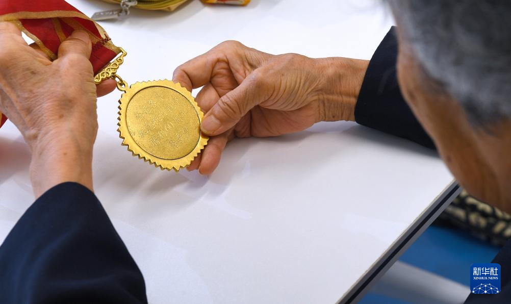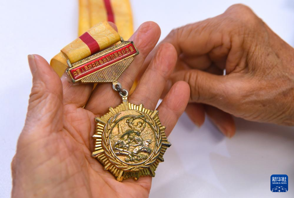6月24日,在香港屯门欣田邨服务处,90岁的抗日老战士林珍展示她荣获的纪念章。新华社记者 陈铎 摄
