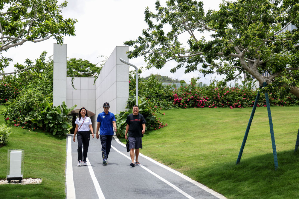 ↑2025年6月21日,天沐赛艇会的合伙人汤少文、朱铭琨和陈志鹏(由左至右)走在赛艇公园内。新华社记者 毛思倩 摄
