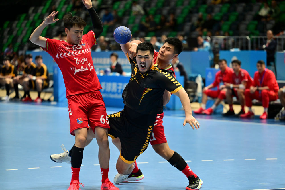 ↑2025年11月8日,江苏队球员谢庆龙(中)在比赛中进攻。当日,在香港进行的第十五届全国运动会男子手球半决赛中,江苏队23比22战胜北京队。新华社记者 于洋 摄