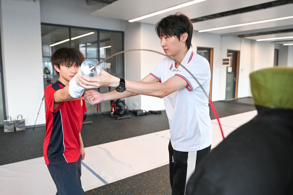 ↑2025年6月19日,广东现代五项运动协会教练员肖勇炫(右)纠正广州市中黄港澳子弟学校港籍生张嗣涛击剑技术细节。新华社记者 肖恩楠 摄