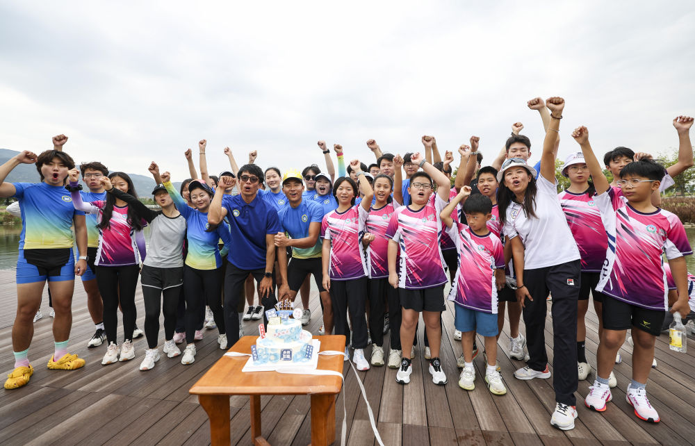 ↑2025年11月1日,赛艇队成员在训练后为教练朱铭琨和学员赵煜阳庆祝生日。新华社记者 胡星宇 摄