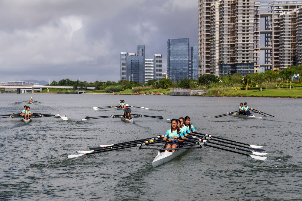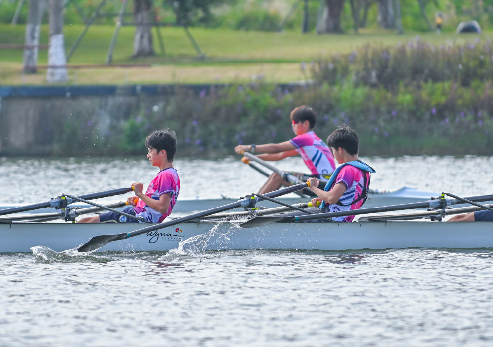 ↑2025年6月21日,学员们在天沐河上进行赛艇训练。新华社记者 毛思倩 摄