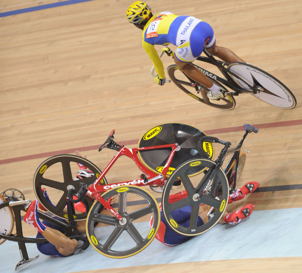 ↑2010年11月16日,中国香港选手黄蕴瑶(下右)在比赛中摔倒。当日,第16届亚运会场地自行车女子记分赛发生了严重的车辆相撞导致车手摔倒的事故,几名选手因伤退出比赛。新华社记者 李尕 摄