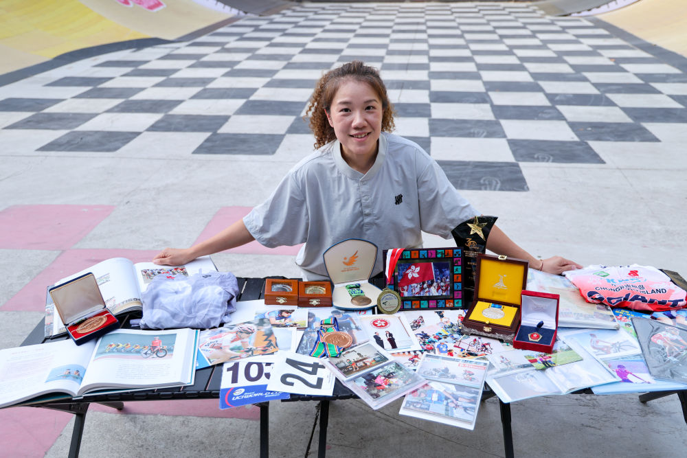 ↑2025年10月31日,在位于深圳福田区的HOLE SHOT骑行公园,黄蕴瑶展示运动员时期的奖牌和照片。新华社记者 梁旭 摄