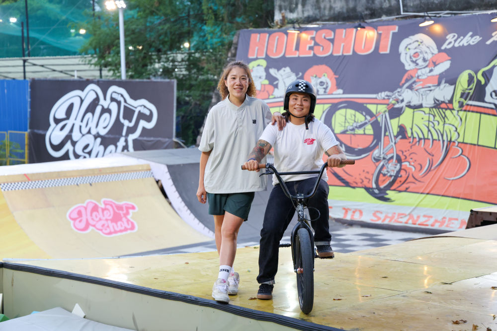 ↑2025年10月31日,黄蕴瑶(左)和她的合作伙伴王思杨子在位于深圳福田区的HOLE SHOT骑行公园内合影。新华社记者 梁旭 摄
