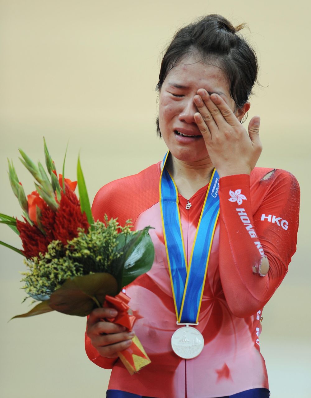 ↑2010年11月16日,中国香港选手黄蕴瑶在领奖台上流泪。当日,第16届亚运会场地自行车女子记分赛在广州自行车轮滑极限运动中心进行,中国香港选手黄蕴瑶以27分的成绩获得亚军。新华社记者 李尕 摄