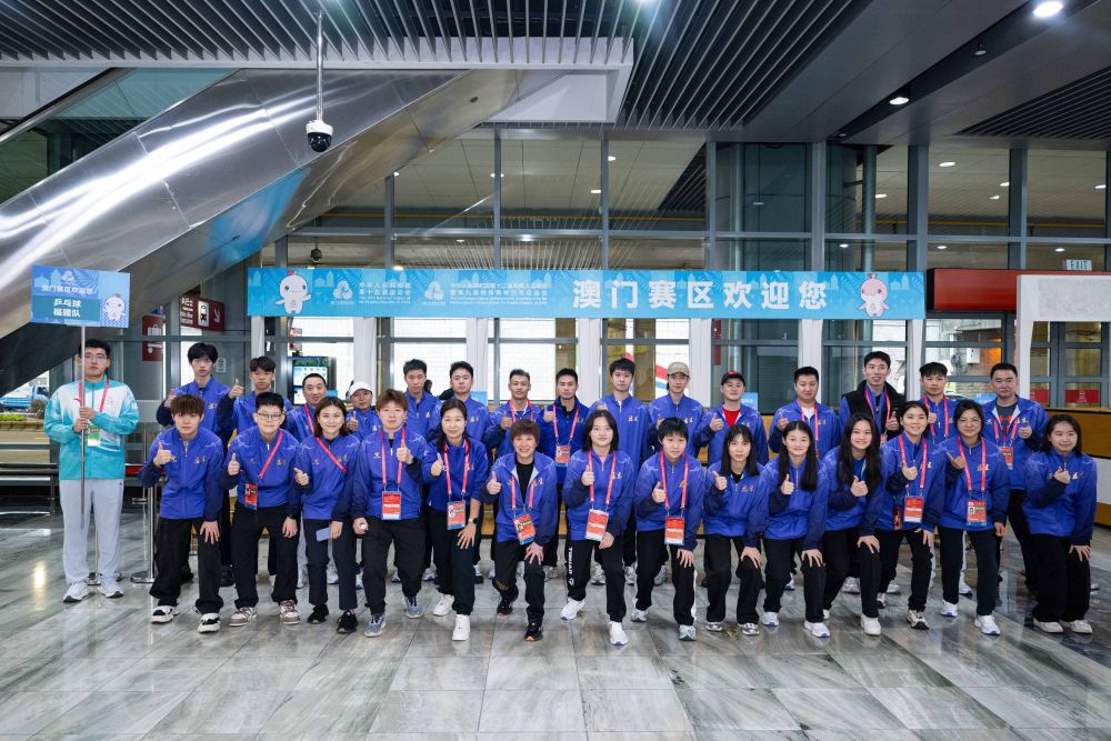 ↑2025年11月4日,福建队在澳门国际机场合影。当日,参加第十五届全国运动会乒乓球项目的各代表队陆续抵达澳门。新华社发(张金加摄)