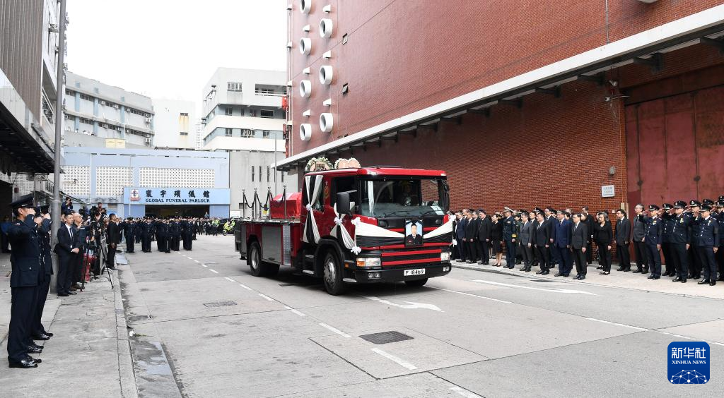 12月19日,由消防车改装的灵车离开位于香港九龙红磡的世界殡仪馆。新华社记者 陈铎 摄