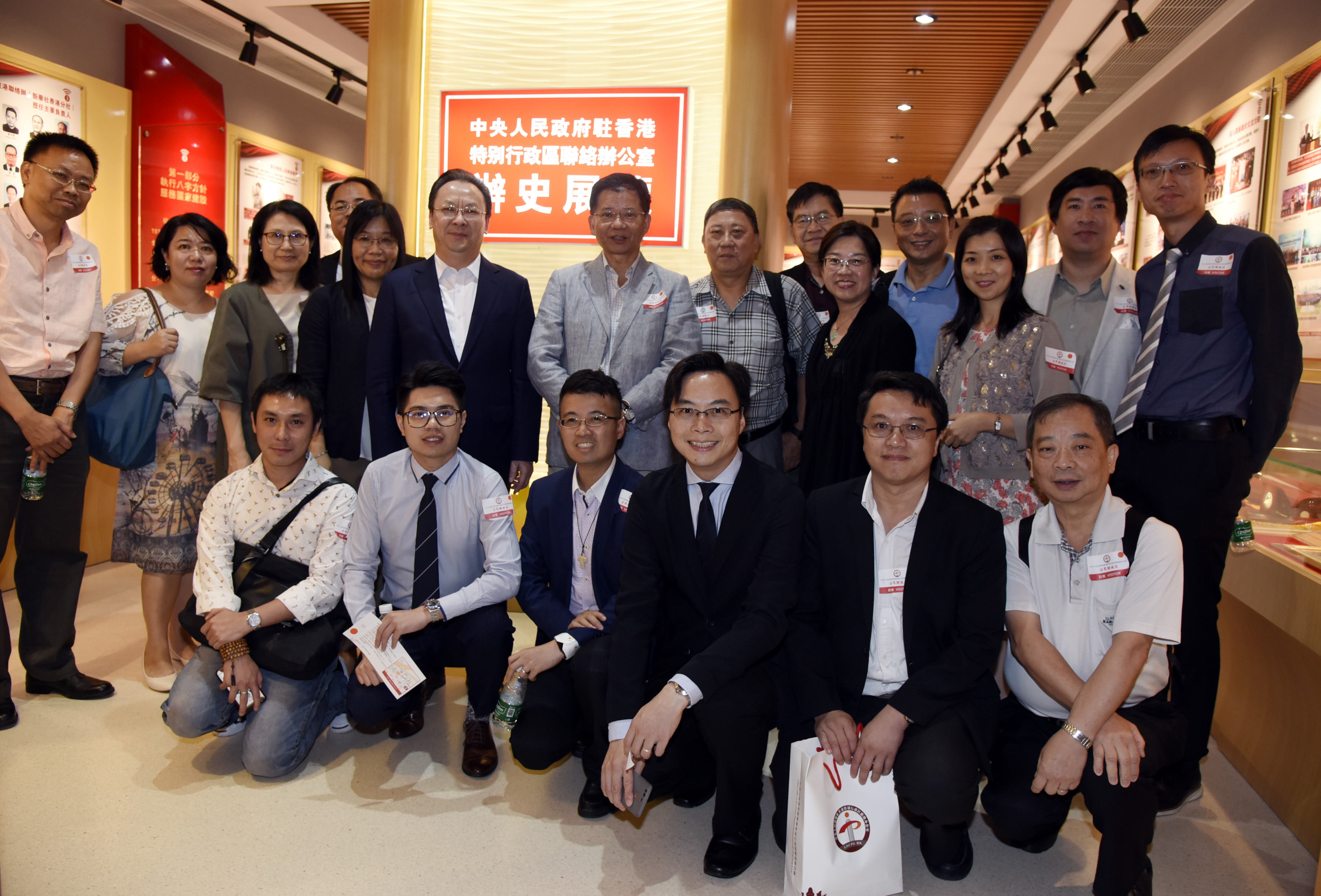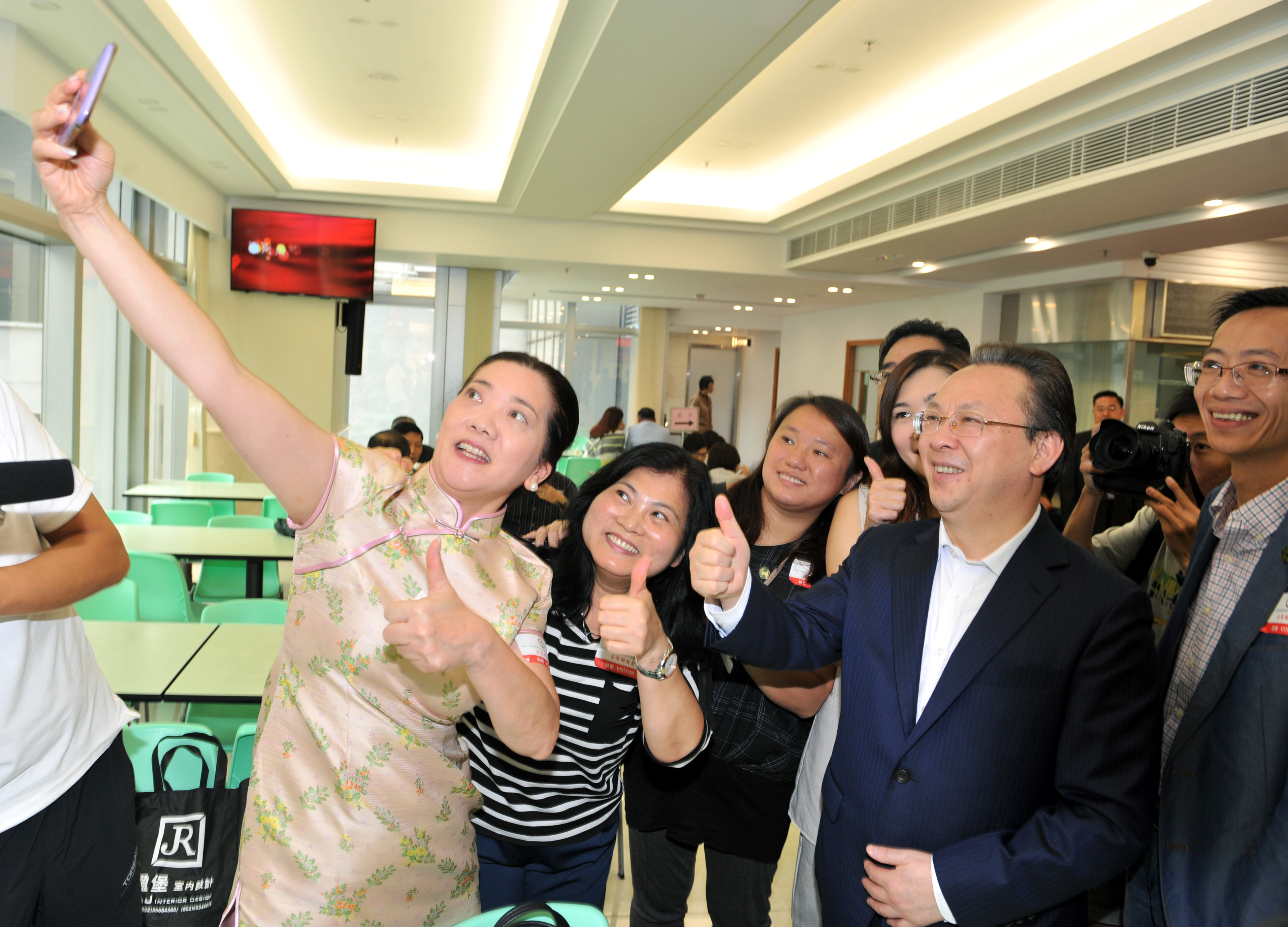 ?来宾在8楼员工餐厅与谭铁牛副主任自拍留影。(图片来源:中央政府驻港联络办)?