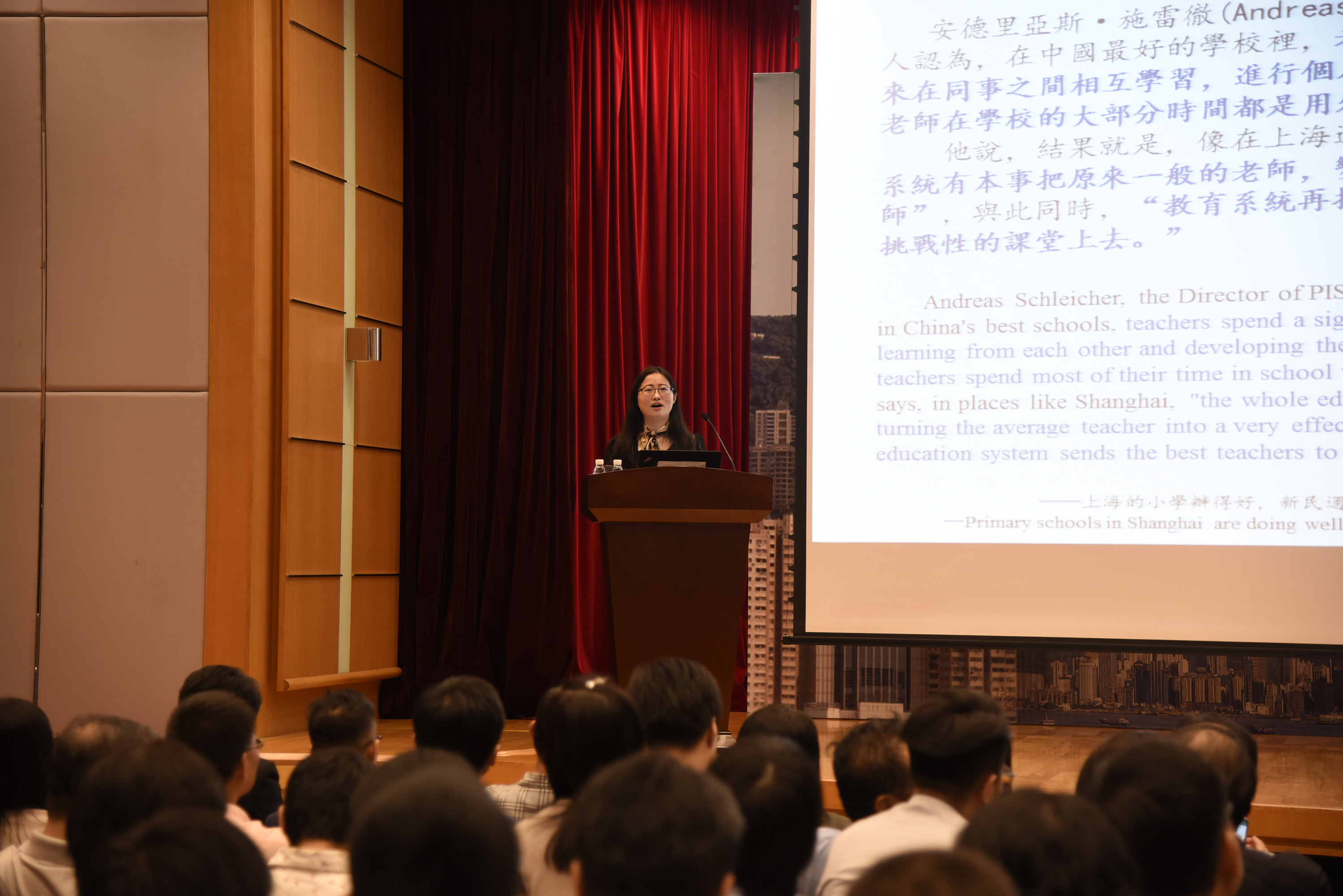 上海市教委教研室副主任王月芬作关于上海教育改革的专题报告。(图片来源:中央政府驻港联络办)