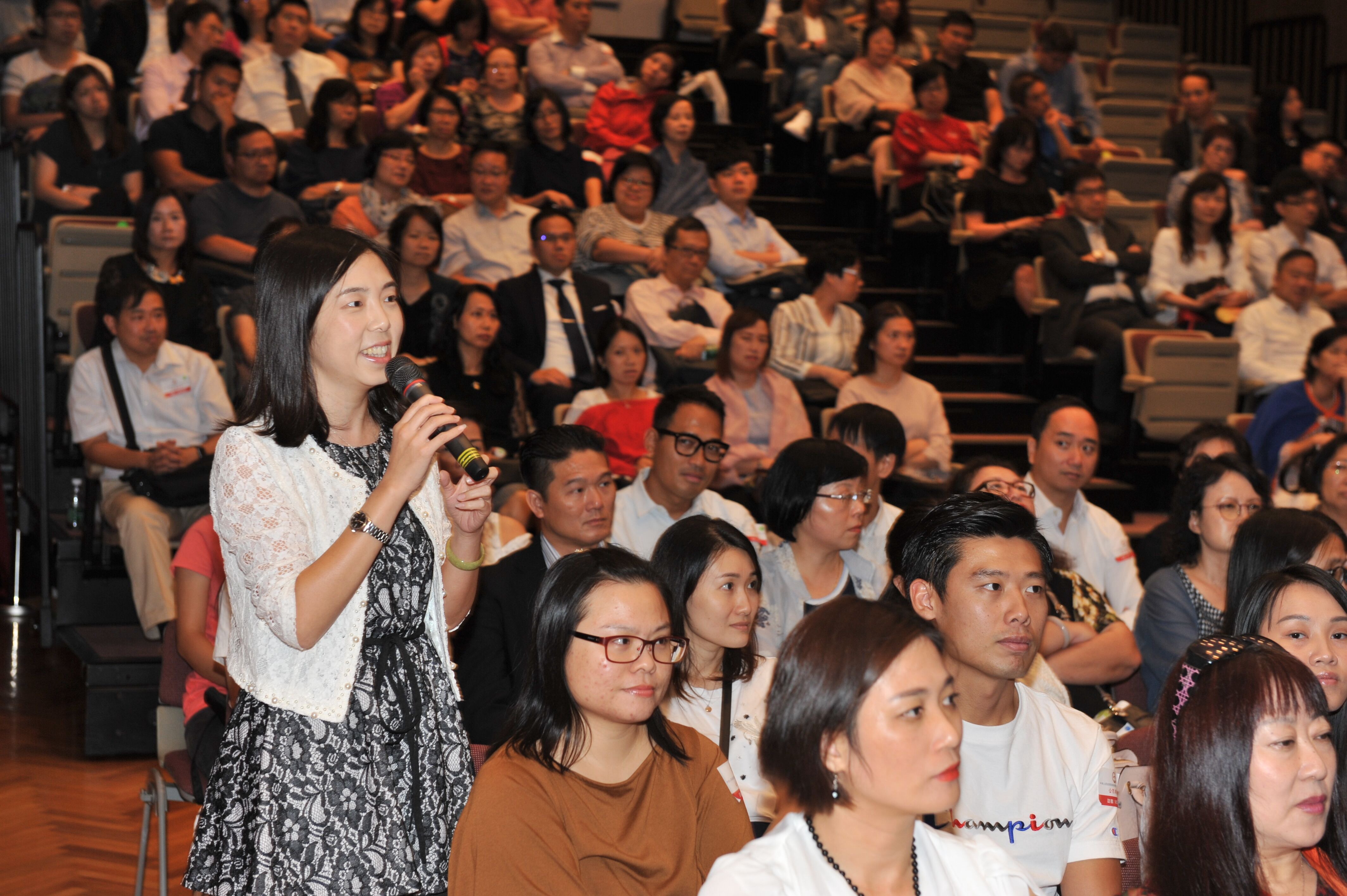 ?教师代表与王月芬主任在报告会进行互动。(图片来源:中央政府驻港联络办)