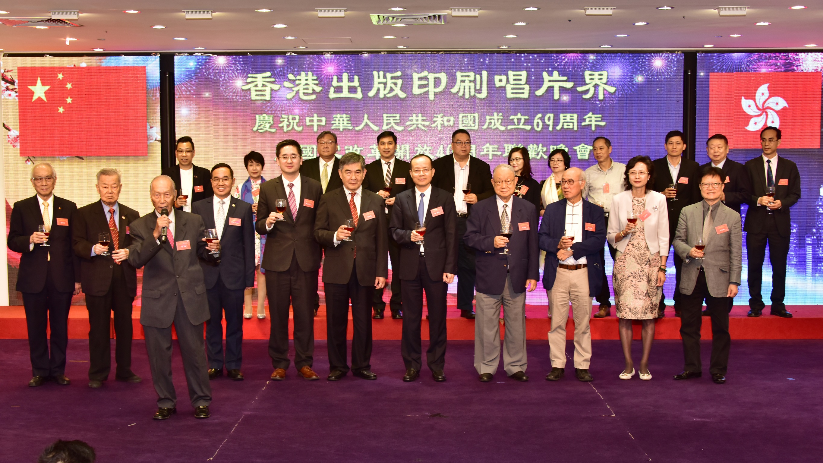 本网讯 9月12日,我办副主任杨健应邀出席并主礼香港出版印刷唱片界庆祝中华人民共和国成立69周年暨国家改革开放40周年联欢晚会。近400位香港出版、印刷、唱片界人士欢聚一堂,共祝祖国繁荣富强、香港和谐发展。