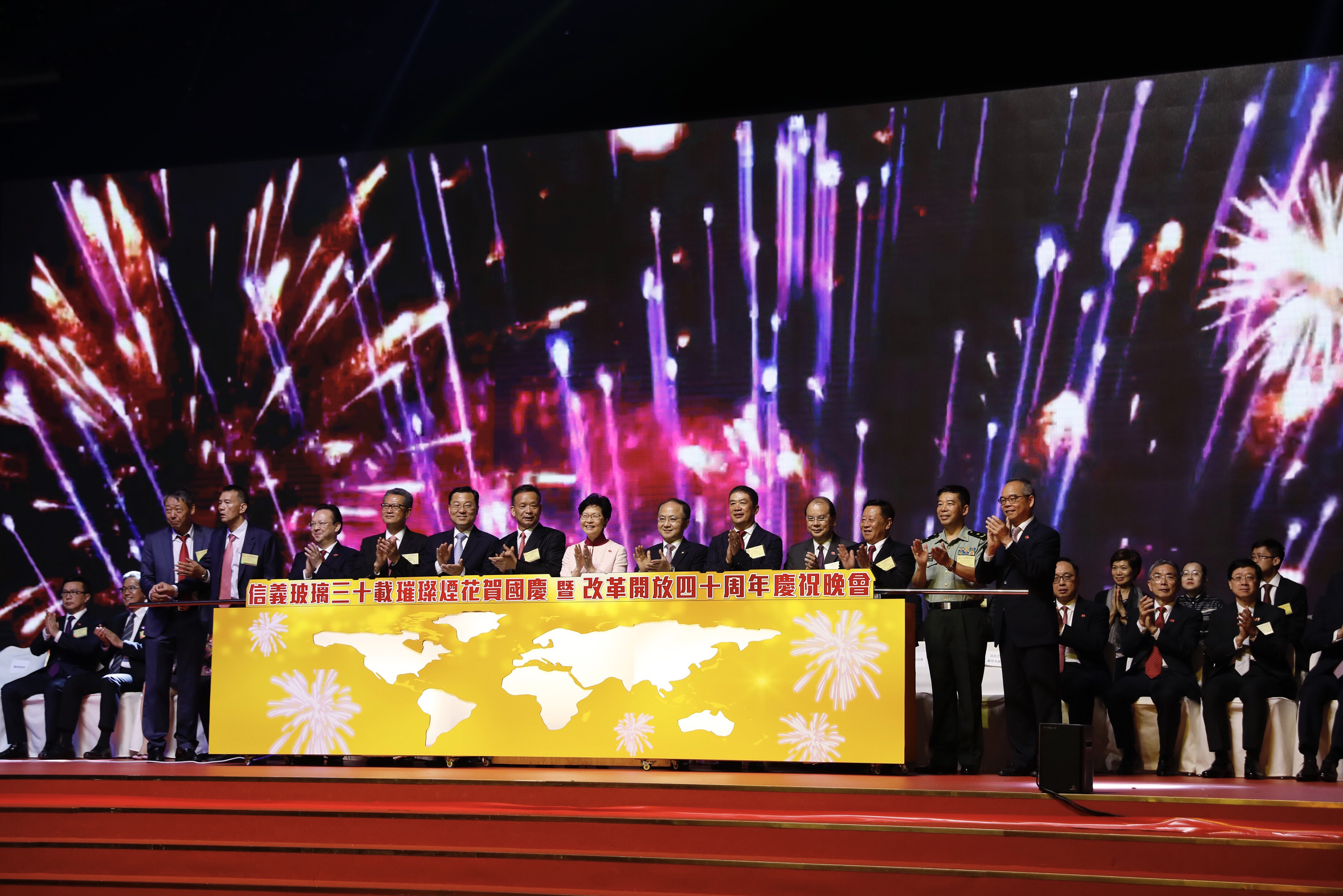 本网讯 10月1日晚,为庆祝中华人民共和国成立69周年和国家改革开放40周年,香港信义集团赞助举办“璀璨烟花贺国庆暨改革开放40周年”庆祝晚会和维港烟花汇演,香港特区行政长官林郑月娥,我办主任王志民、副主任谭铁牛,外交部驻港特派员公署特派员谢锋,解放军驻港部队副司令员田永江等共同担任晚会主礼嘉宾并观看了烟花汇演。