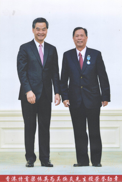 因积极参与社会服务,尤其对福建社群贡献良多,2013年,吴换炎获香港特区政府颁发荣誉勋章。图为时任香港特首梁振英为吴换炎授勋。