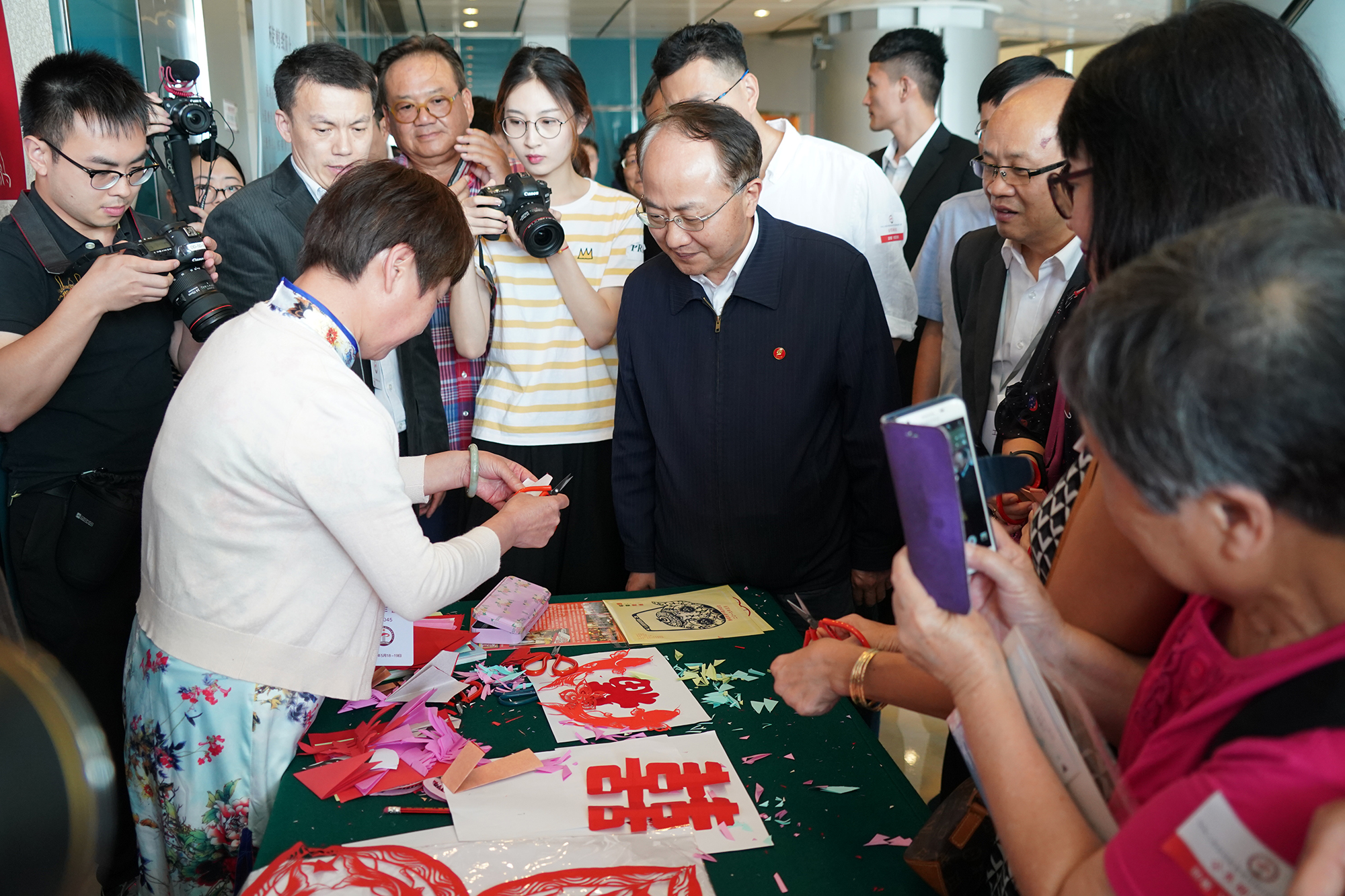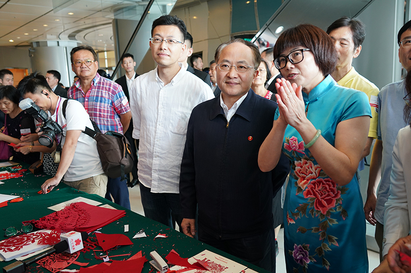 王志民主任参观剪纸艺术展台。(图片来源:中央政府驻港联络办)