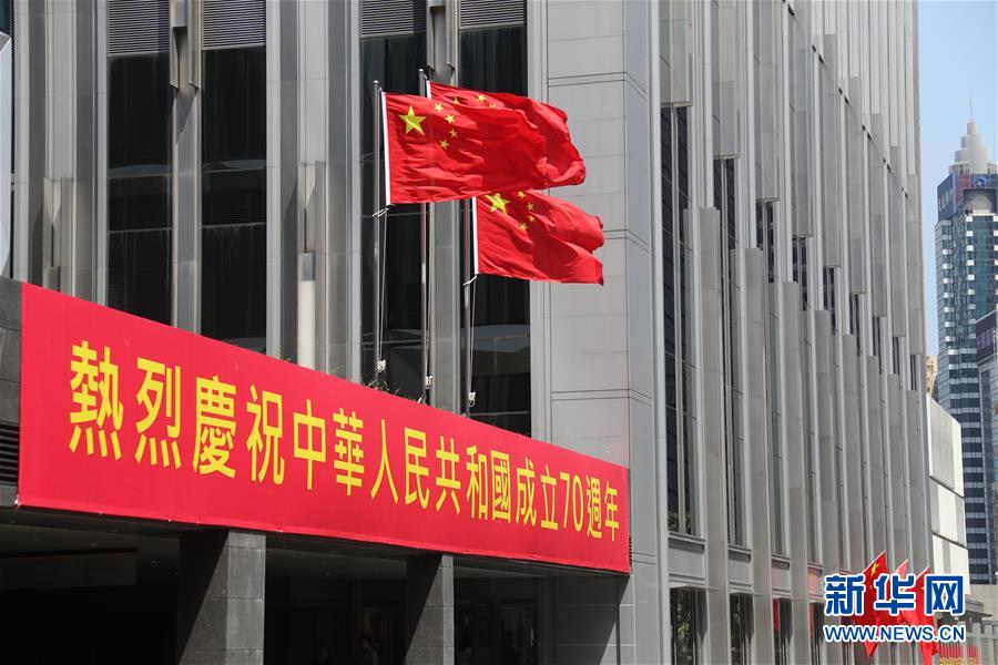 这是9月24日在香港告士打道上拍摄的国庆标语。国庆节将至,香港街头悬挂国旗,张贴国庆标语,庆祝中华人民共和国成立70周年。(新华社 卢烨 摄)