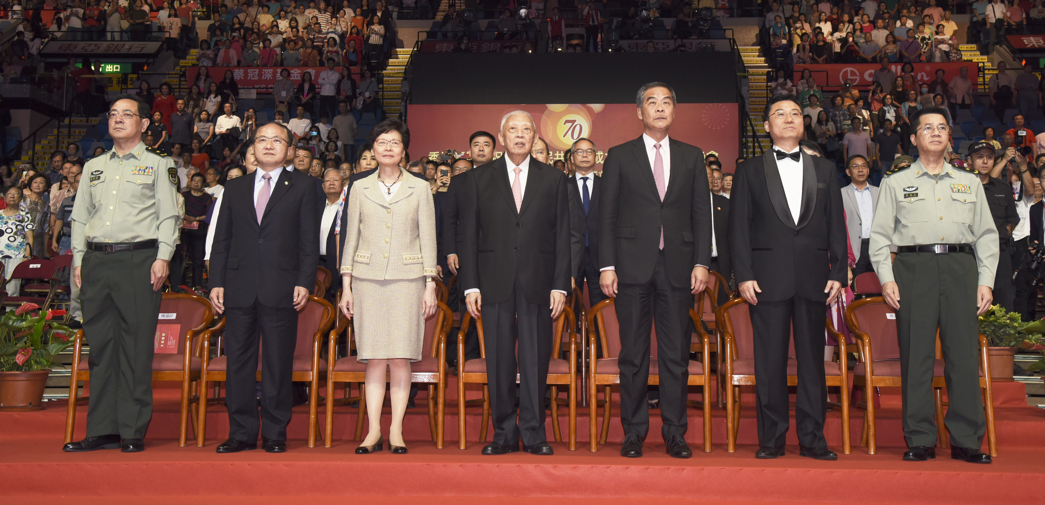 本网讯 10月2日晚,香港同胞庆祝中华人民共和国成立70周年文艺晚会在香港体育馆举行。全国政协副主席董建华、梁振英,香港特区行政长官林郑月娥,我办主任王志民,外交部驻港公署特派员谢锋及驻港部队司令员陈道祥、政委蔡永中等共同出席晚会,与5000余名香港市民一同观看演出。