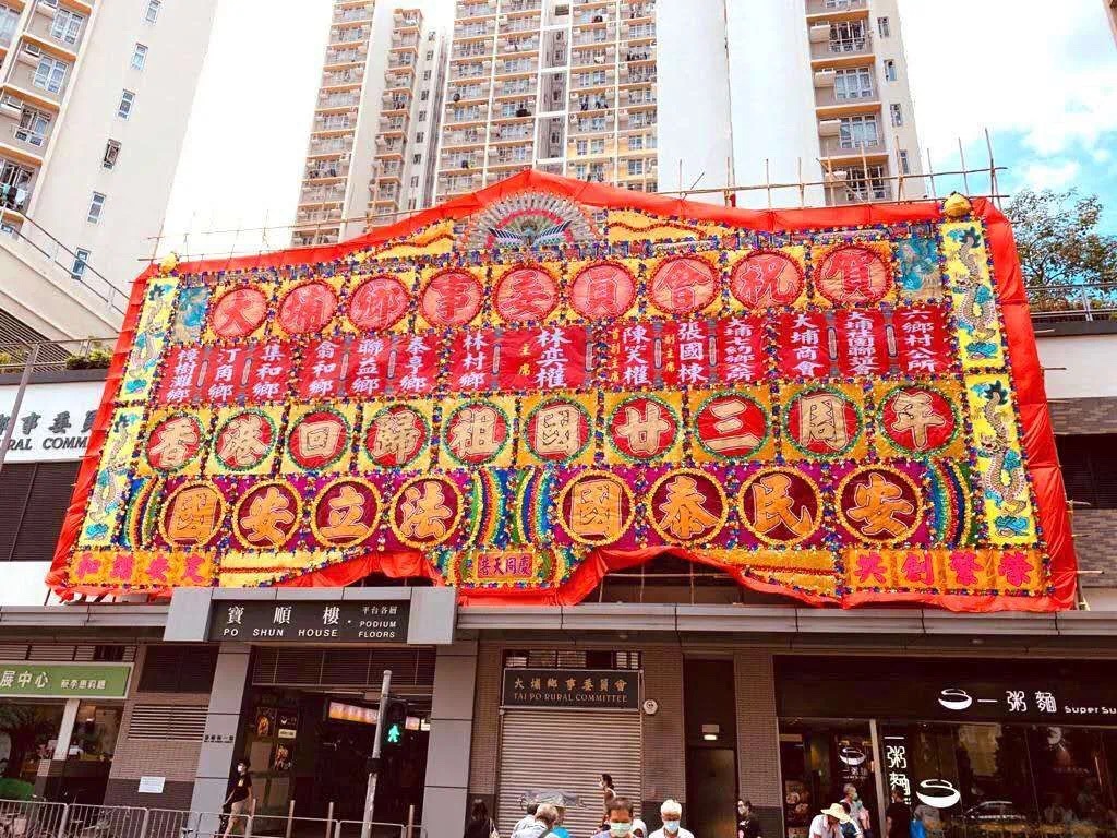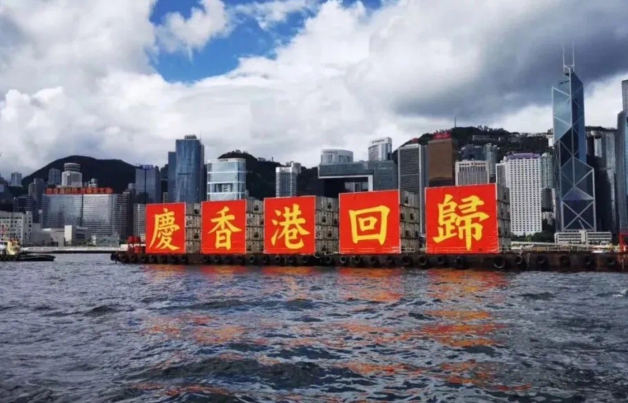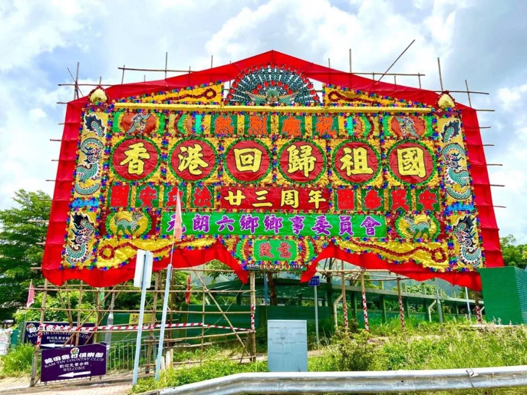 7月1日,香港新界大埔、沙田、元朗、荃湾等地区乡民,纷纷在交通交汇处以及醒目显眼位置,以香港独特的传统手工艺,高高展示富有新界传统特色的巨型绚丽花牌,向祖国、向香港表达美好的祝福。