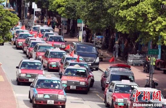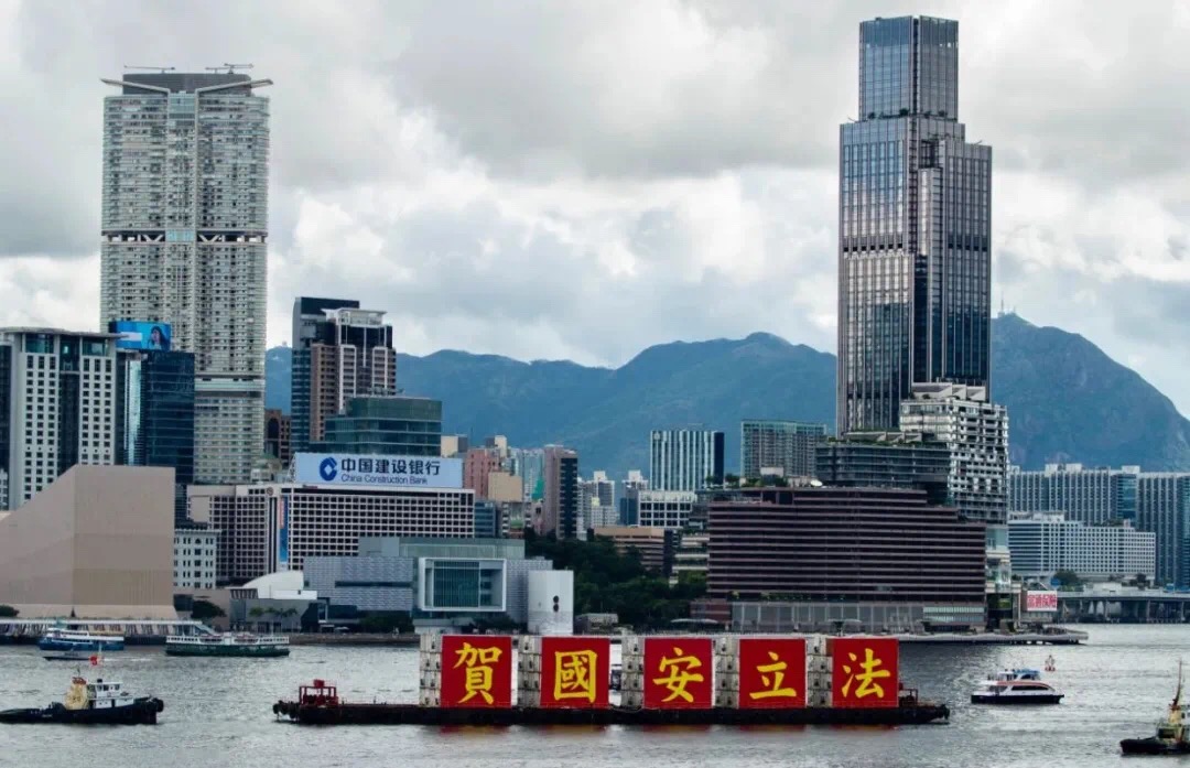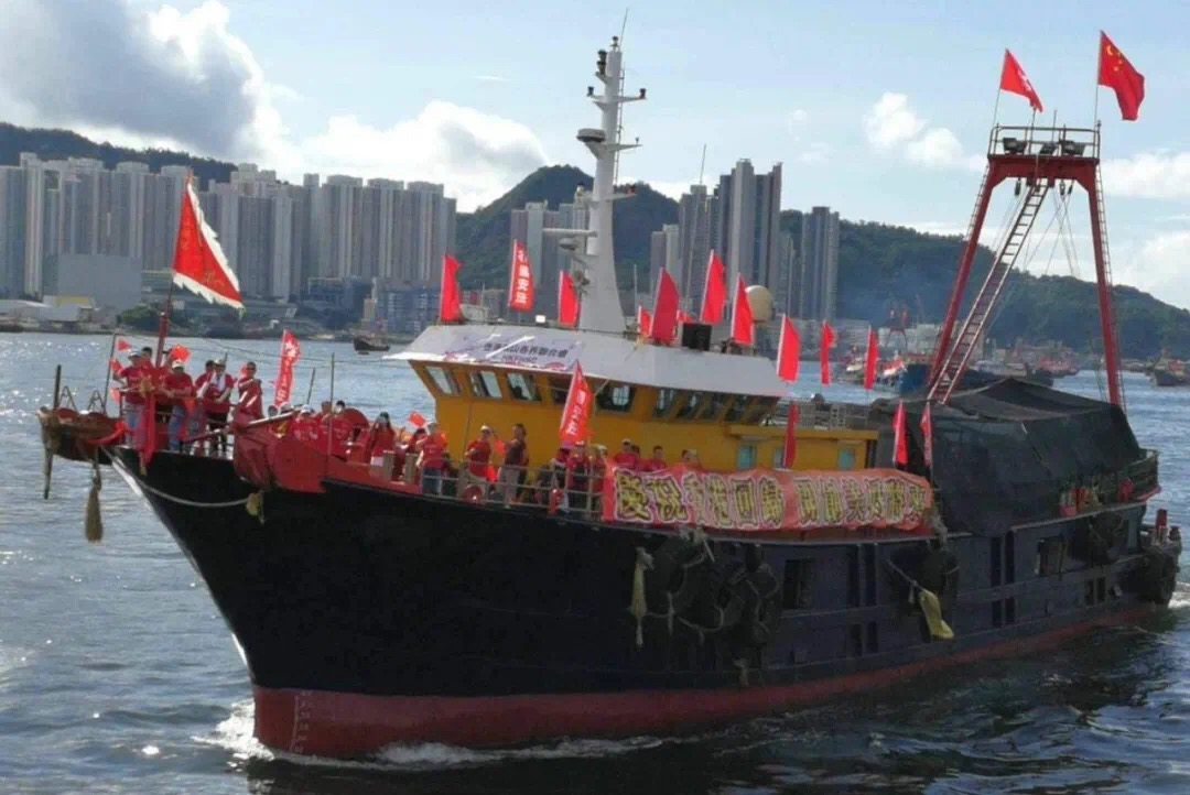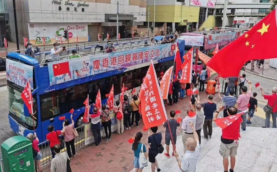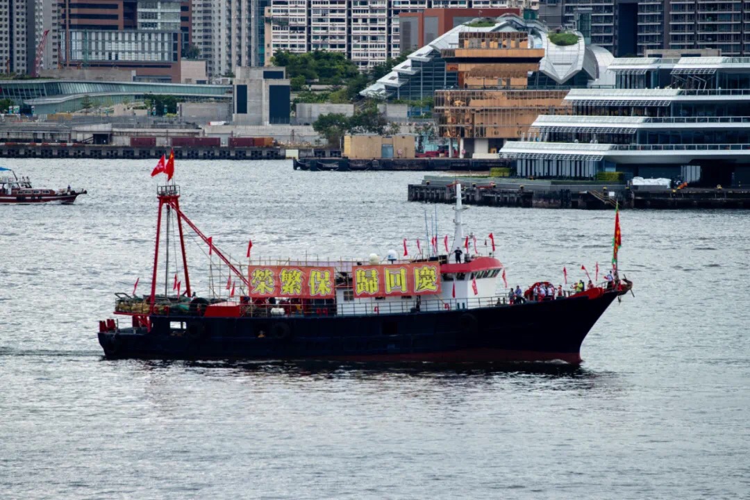 7月1日,超过100艘悬挂国旗、区旗及“贺国安立法”主题横幅的渔船,由香港仔出发巡游至中环码头。巴士花车和的士也在全港巡游。