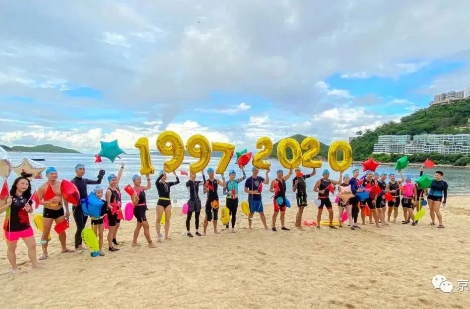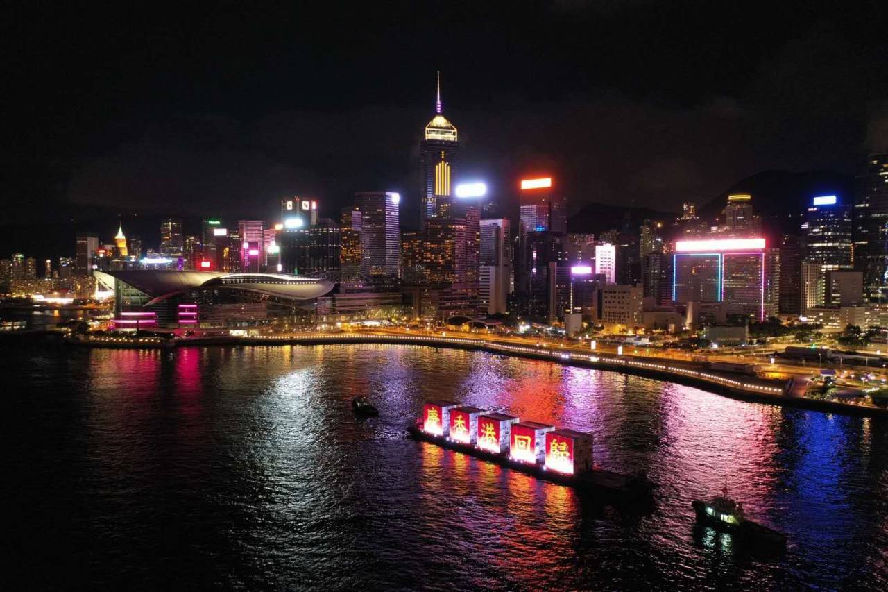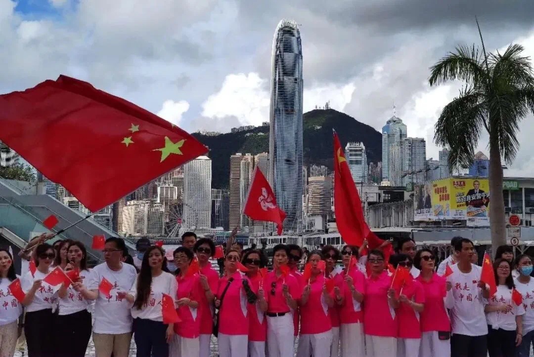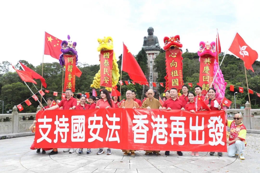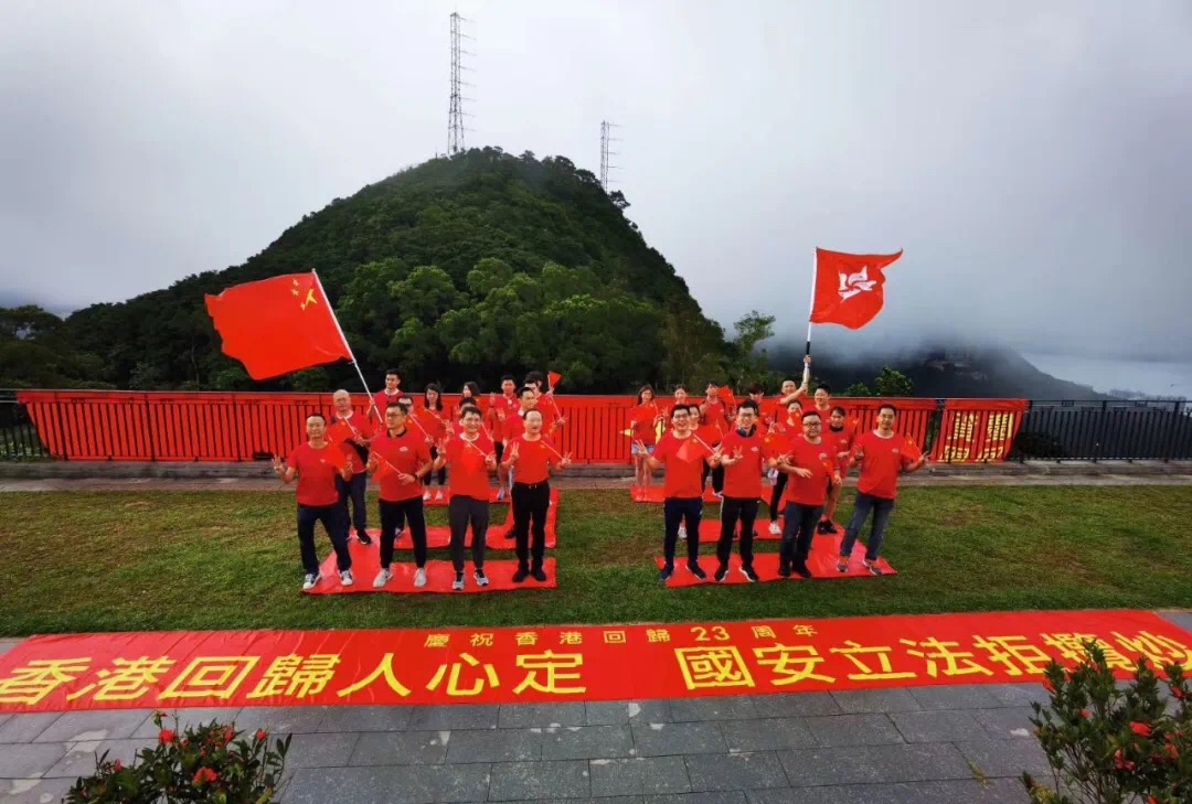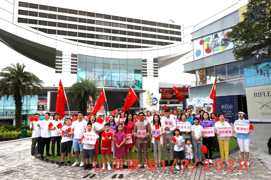 7月1日,香港市民在山顶广场、天坛大佛广场、中环摩天轮等多个地标高唱国歌,表达庆祝香港回归,支持国安立法的共同心声。