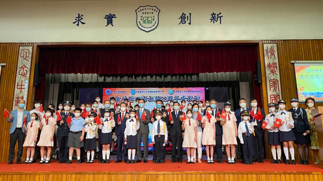 7月1日,全港各区学校在校园内举行升旗礼、唱国歌等活动,庆祝香港回归祖国23周年。