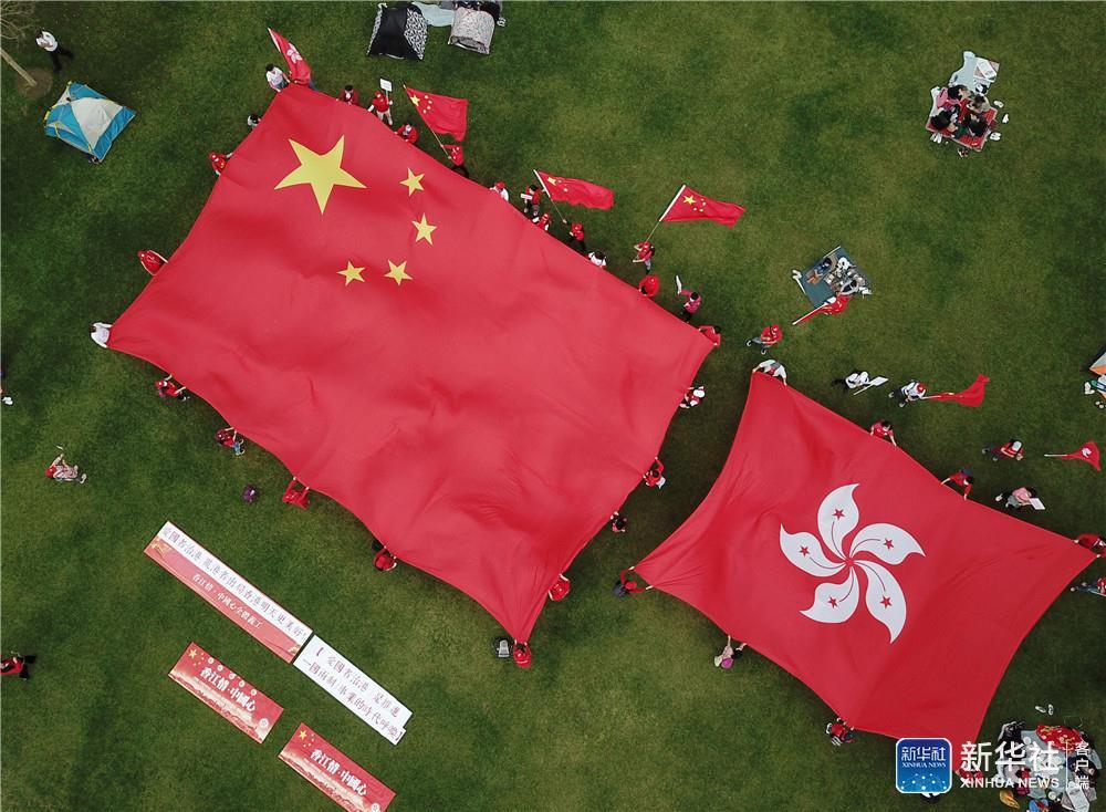 在香港添马公园,香港市民展示五星红旗和香港特区区旗,支持落实“爱国者治港”(3月6日无人机照片)。(新华社记者 李钢 摄)