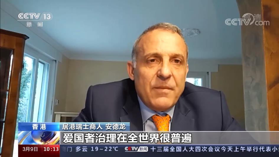 居港瑞士商人 安德龙:爱国者治理在全世界很普遍,没有任何国家会允许不爱国的人加入管治队伍,完善选举制度会让香港受益,让社会秩序更加稳定。“两制”的前提是“一国”,捍卫国家主权是最重要的。