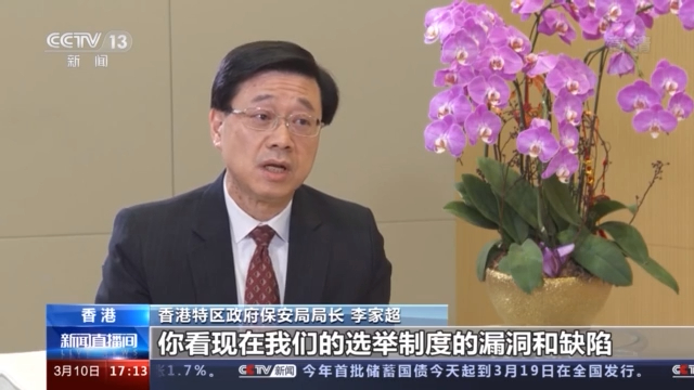 香港特区政府保安局局长 李家超:你看现在我们的选举制度的漏洞和缺陷,带来什么问题呢?与外国勾结的人也可以进入我们现在宪制的权力里面,这些破坏很大,所以现在“爱国者治港”就会结束这些破坏、这些纷乱,这才可以解决我们香港的很多问题,恢复我们的民生、恢复我们的经济,融入国家大局。