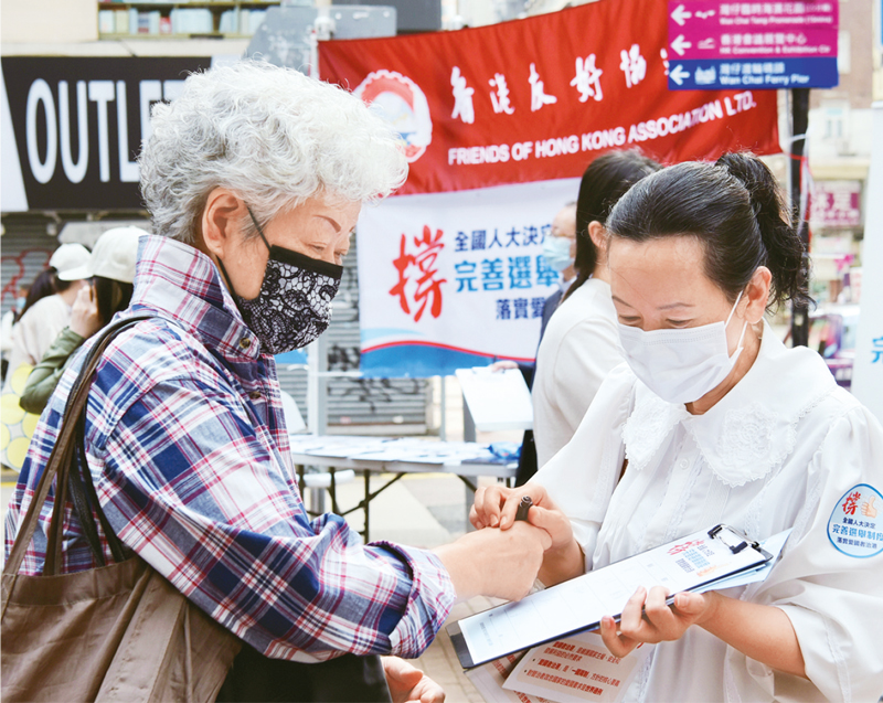 2021年3月12日,香港市民到湾仔街站签名支持完善香港选举制度,落实“爱国者治港”。(中新社记者 李志华/摄)