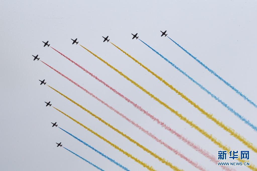 7月1日上午,庆祝中国共产党成立100周年大会将在北京天安门广场隆重举行。这是飞行庆祝表演。(新华社记者 李梦娇 摄)