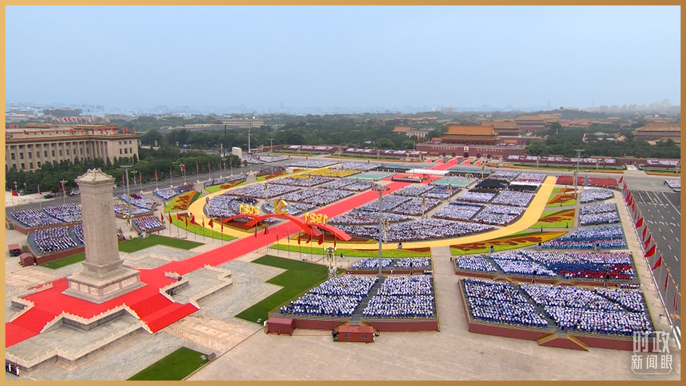 建党百年的庆祝大会,盛大而隆重。从空中俯瞰,天安门广场呈现“巨轮启航”的造型,巨轮的前甲板一直延伸到人民英雄纪念碑,高7.1米、宽7.1米的党徽在船舷上高高挺立,巨轮两侧100面红旗迎风招展。