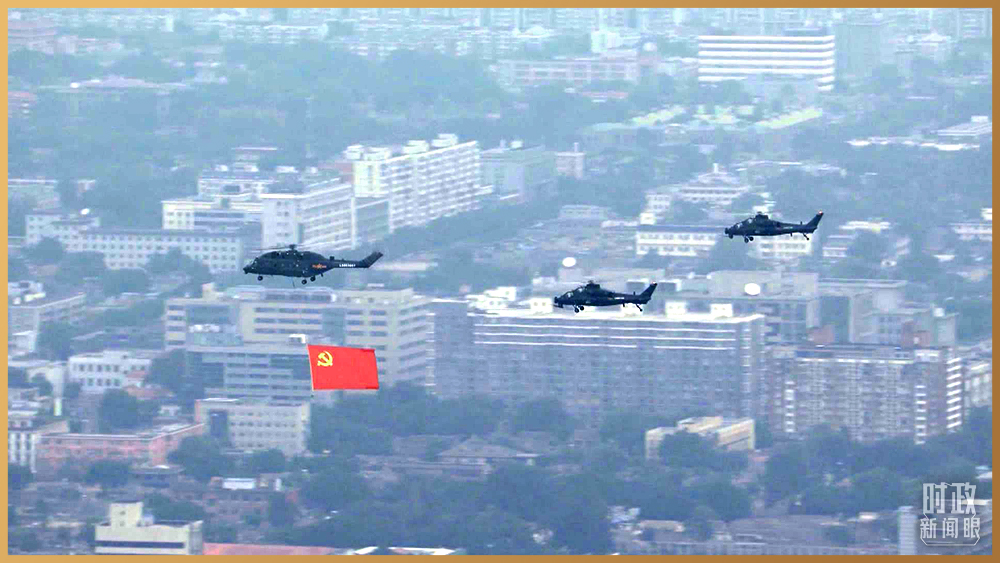 △直升机悬挂鲜红的中国共产党党旗飞过。