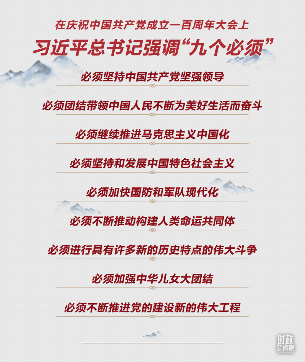 在7月1日的庆祝中国共产党成立100周年大会上,习近平强调,我们要用历史映照现实、远观未来,从中国共产党的百年奋斗中看清楚过去我们为什么能够成功、弄明白未来我们怎样才能继续成功。以史为鉴、开创未来,总书记提出“九个必须”,并作出许多新论断、新表述。