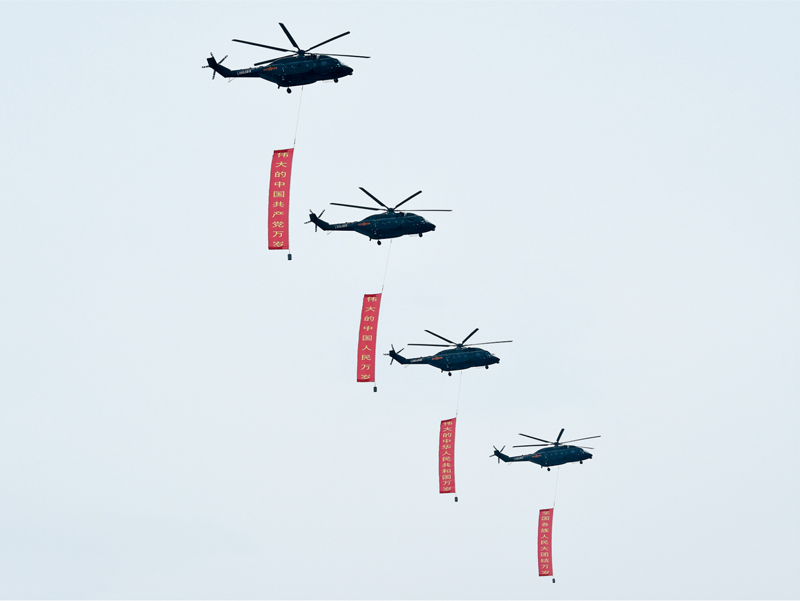 2021年7月1日上午,庆祝中国共产党成立100周年大会在北京天安门广场隆重举行。在大会开始前的飞行庆祝表演上,沿着党旗指引的方向,4架直升机分别悬挂写有“伟大的中国共产党万岁”、“伟大的中国人民万岁”、“伟大的中华人民共和国万岁”、“全国各族人民大团结万岁”的巨幅标语迎风向前。(新华社记者 戴天放/摄)