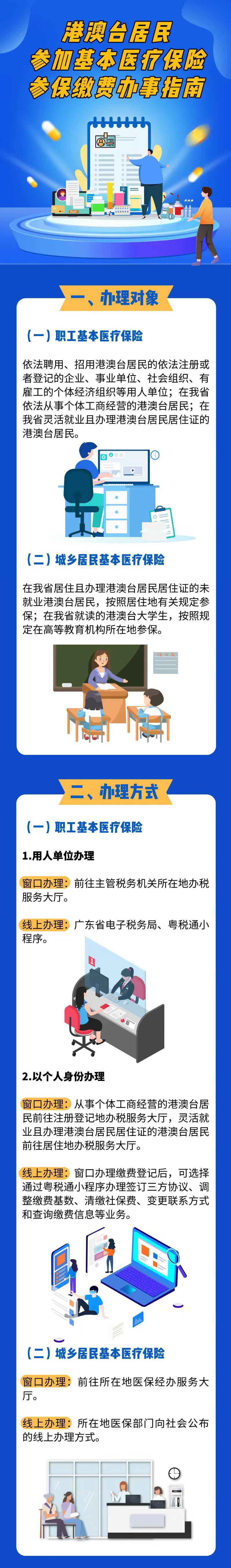 广东省医疗保障局联合广东省税务局日前印发《香港澳门台湾居民参加基本医疗保险参保缴费办事指南》(以下简称《办事指南》),以便更好促进在广东省学习、就业、生活的港澳台居民参加基本医疗保险。