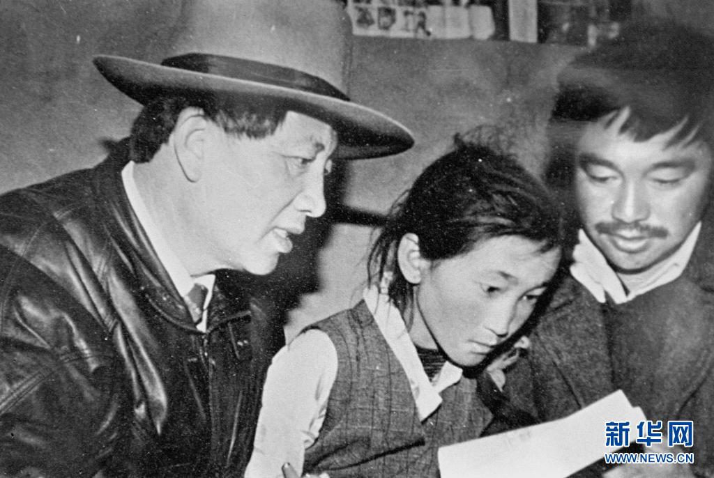 在西藏工作期间,孔繁森(左)在辅导藏族儿童读书(资料照片)。(新华社发)