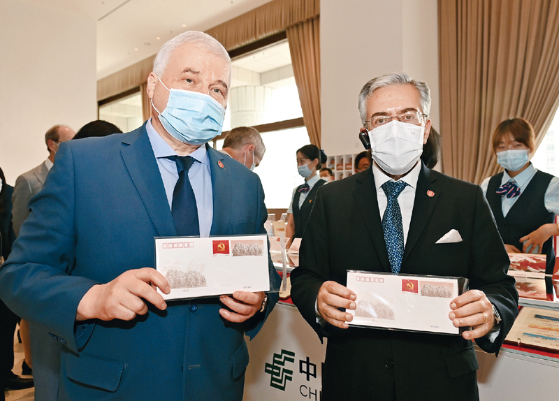 2021年6月24日上午,一百多位外国驻华使节和国际组织驻华代表在中国共产党历史展览馆参观“‘不忘初心、牢记使命’中国共产党历史展览”。图为俄罗斯驻华大使杰尼索夫(左)和阿尔及利亚驻华大使艾哈桑?布哈利法展示在展览馆内主题邮局购买的纪念邮品。(中新社记者 侯宇/摄)