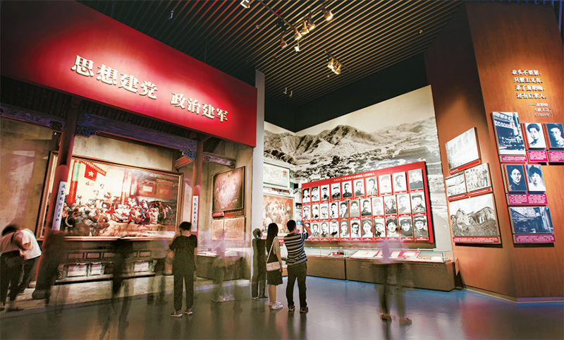 1929年12月,中共红四军第九次代表大会在福建上杭古田召开,古田会议确立了思想建党、政治建军的根本原则。图为2021年7月19日,在参观中国共产党历史展览馆举行的“‘不忘初心、牢记使命’中国共产党历史展览”时,观众在油画《古田会议》前驻足。(刘新武/摄)