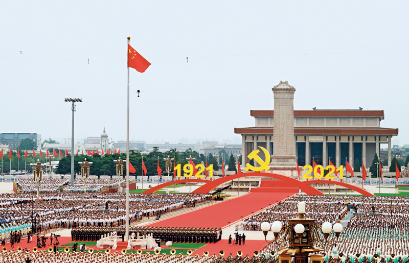 我们党的百年奋斗史,就是一部为中国人民谋幸福、为中华民族谋复兴的历史,一部践行初心使命的历史,一部与人民心连心、同呼吸、共命运的历史。图为2021年7月1日上午,庆祝中国共产党成立100周年大会在北京天安门广场隆重举行。(新华社记者 兰红光/摄)
