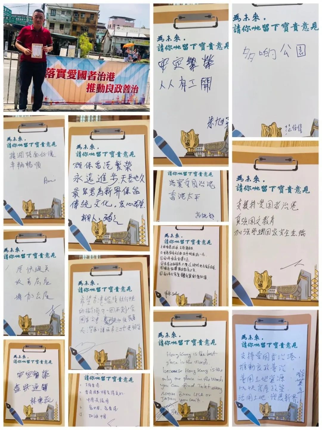 全国政协常委林建岳、胡定旭11日在街站宣传选举制度安排及他们的政纲,有市民开心合照并留言写下自己的心声。