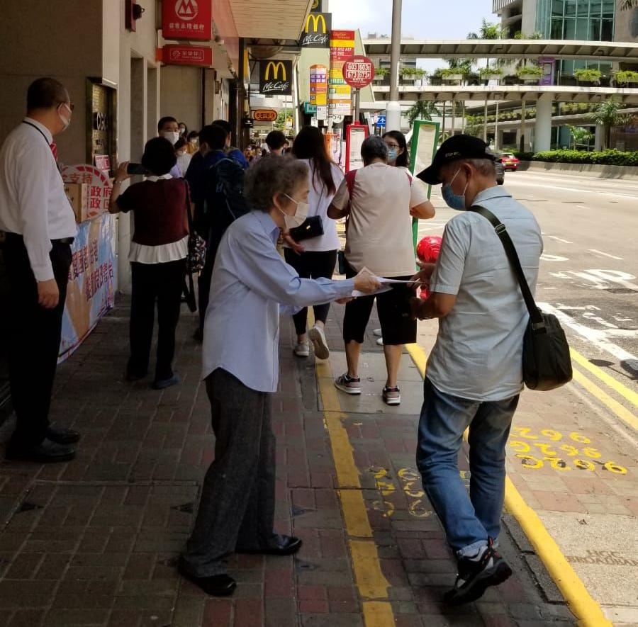 香港中华总商会所属的选委会商界(第二)界别分组选委11日在中总门外设街站,选委袁武、伍淑清等向市民派单张,解答市民疑问,聆听市民声音。