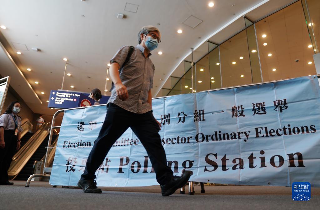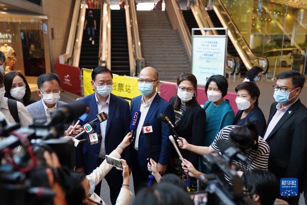 9月19日,2021年香港特别行政区选举委员会界别分组一般选举举行。这是在香港会议展览中心投票站,选民在投票后离开。(新华社记者 王申 摄)