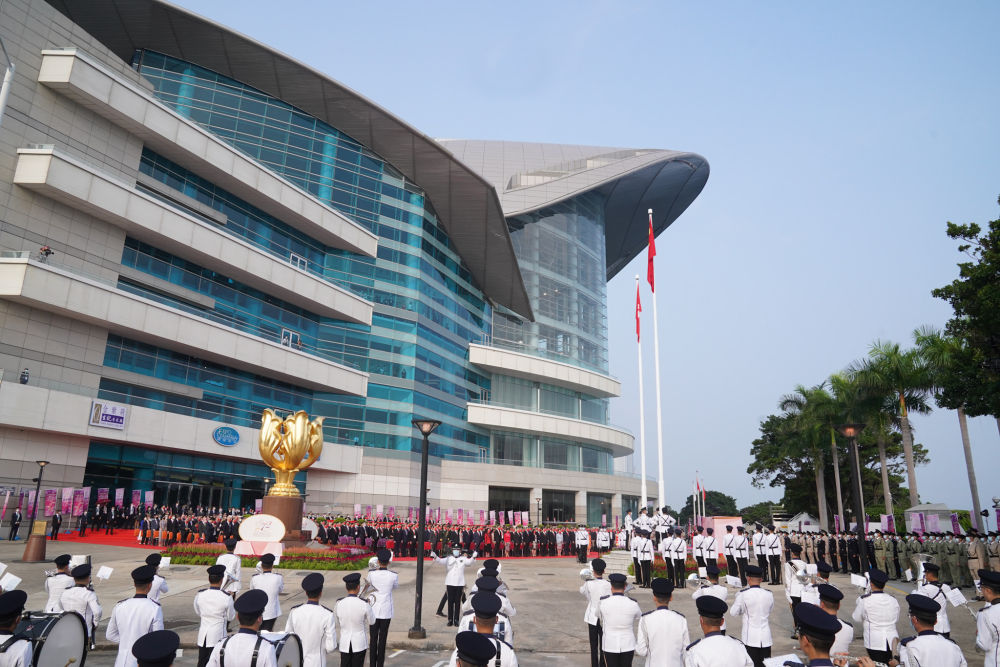 升旗仪式上午8时在金紫荆广场举行。全国政协副主席梁振英、香港特区行政长官林郑月娥、香港中联办主任骆惠宁、中央驻港维护国家安全公署署长郑雁雄、外交部驻港特派员公署特派员刘光源、解放军驻港部队司令员陈道祥、香港特区终审法院首席法官张举能,香港中联办副主任陈冬、谭铁牛、罗永纲、何靖、尹宗华和秘书长王松苗,以及特区政府主要官员、行政会议成员和社会各界知名人士等出席。