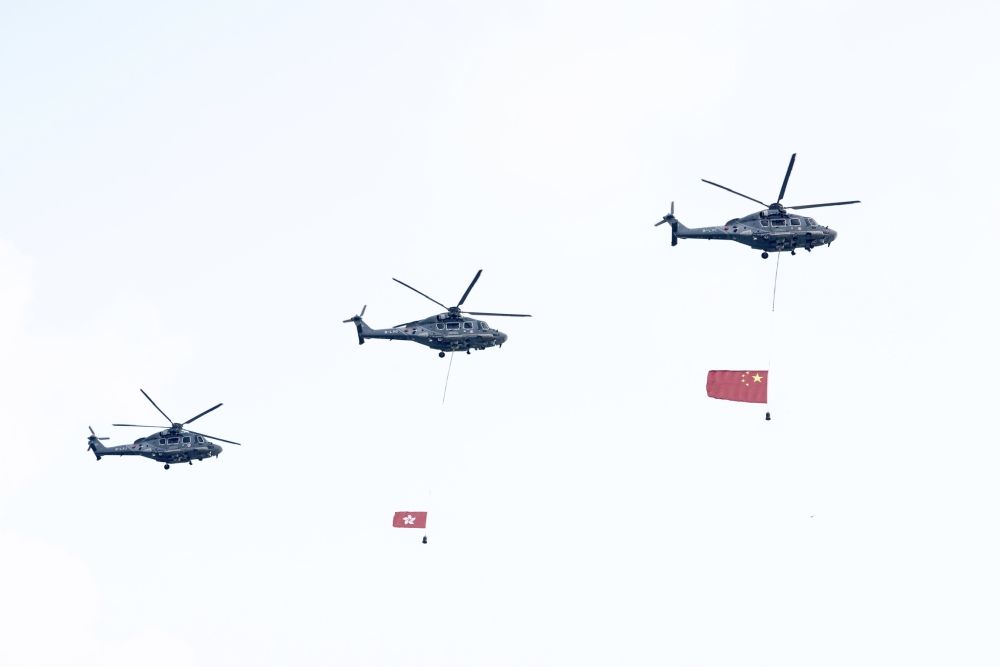 仪式开始后,在香港警察银乐队的奏乐中,仪仗队和护旗队迈步进入金紫荆广场。庄严的国歌奏响,鲜艳的中华人民共和国国旗和香港特区区旗冉冉升起。悬挂着国旗和区旗的特区政府飞行服务队直升机飞过维多利亚港上空,消防处灭火轮喷洒着水花驶过维港水面。