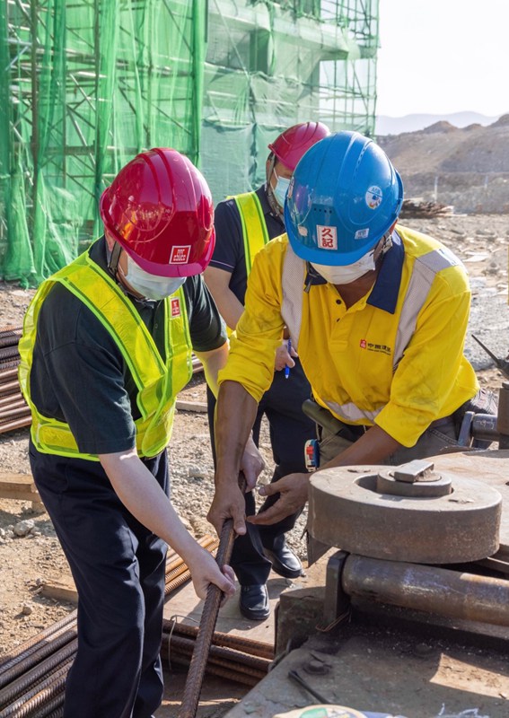 谭铁牛副主任(左)在地盘施工现场向工友学习扎铁。(图片来源:中央政府驻港联络办)
