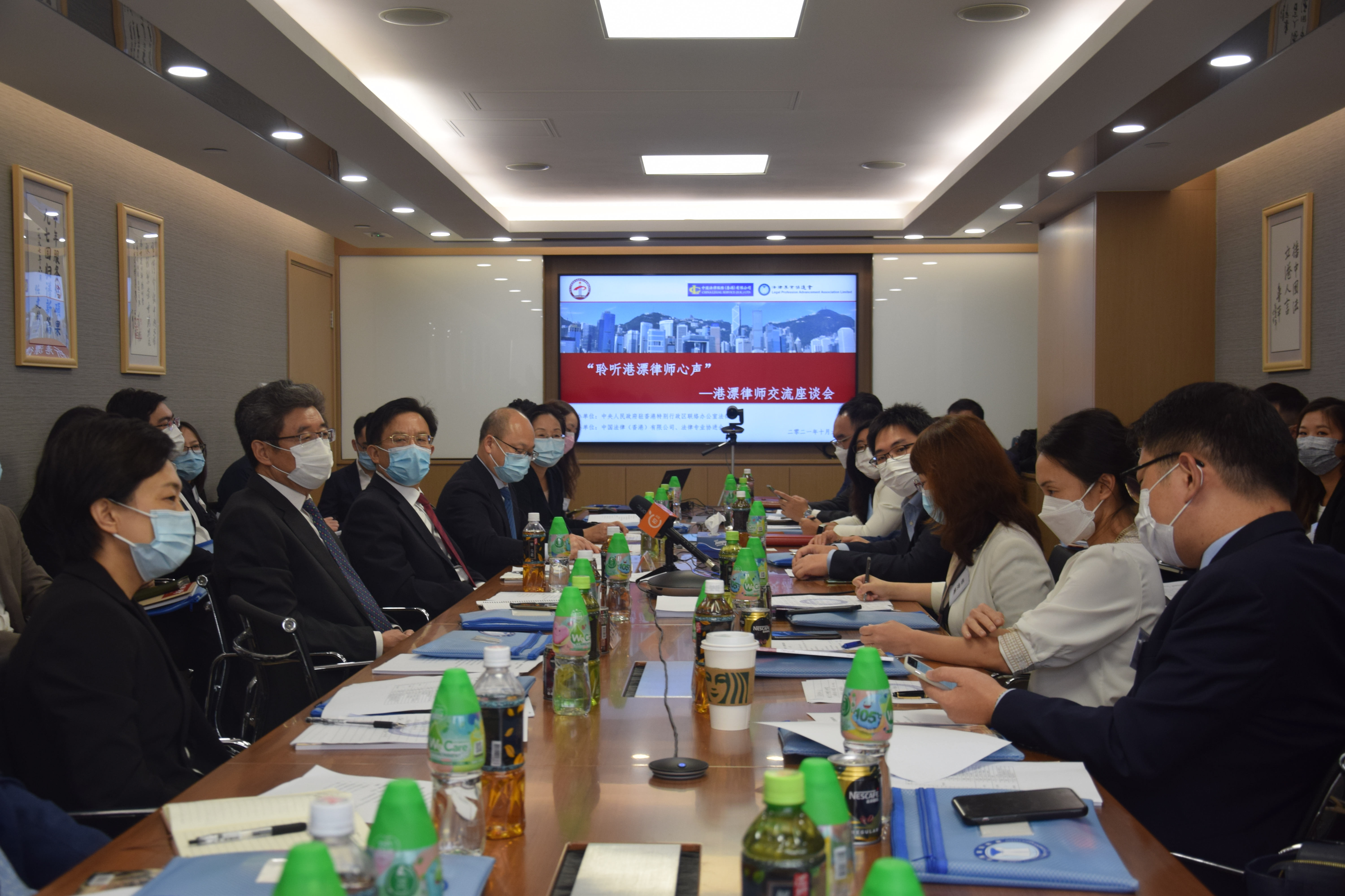 本网讯 10月6日下午,香港中联办秘书长王松苗与法律部同事一起来到位于金钟的中国法律服务(香港)有限公司,与20余名“港漂”律师进行座谈交流。此次走访是中联办“落区聆听 同心同行”系列活动之一。中国法律服务(香港)有限公司董事长郭建安、香港律师会会长陈泽铭参加座谈。